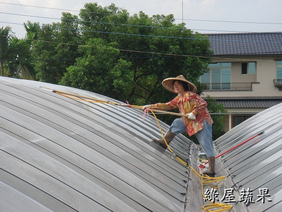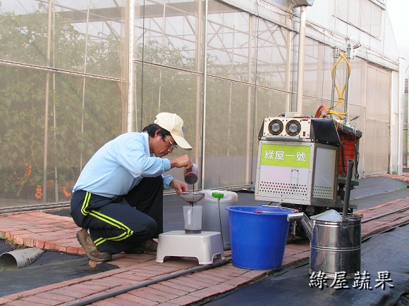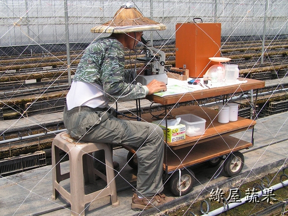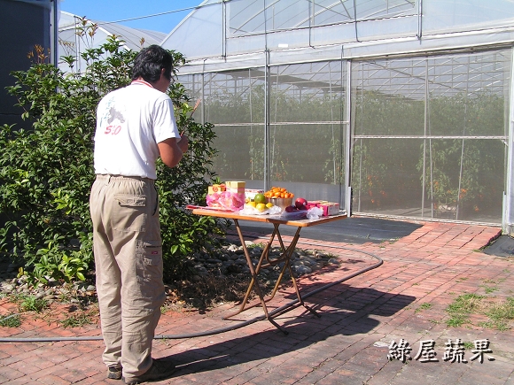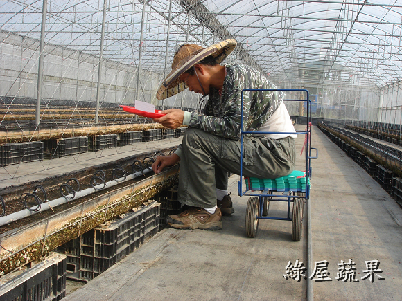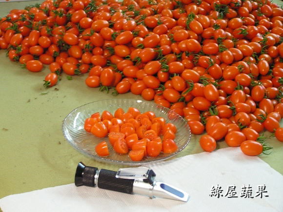 日期:2013/2/28 老一輩的人有一句話:「甘阿蜜尾,卡好吃粿」,意思是說蕃茄 到了產季後期變得很好吃,比年糕還甜!但這句話還是無法形容 綠屋蕃茄特有的風味.高達13brix的甜度配上絕妙的酸甜比, 除非親自品嚐否則不可能相信世上真有這麼好吃的蕃茄。 日期:2013/2/26 一年比一年更有進步,依往年經驗預計二月底產季就結束,但 今年有向農改場拜師學藝,叢勢仍強盛,果實更香甜.預估還可 採收到三月十日,要訂貨還有機會,但出手要快!!! 日期:2013/2/11 利用年節期間修剪枝葉,充足的日光會讓番茄既甜又香.自從 改行當農奴(老戴是這樣自稱的),一切都以作物為重心.過年 除了團圓、祭祖、酬神、當傻女婿,其他的時間還是在田裡 忙得不可開交,但重點是樂在其中。 日期:2013/2/3 再一週就要過年了,滿園的番茄等著豔陽來熟成,熱情的顧客 也等著收到甜蜜蜜的番茄.奈何一大早就飄著細雨,接著一整 天陽光都不肯露臉,打開收音機聽廣播才知到除夕之前都會是 陰冷的天氣。老戴整天都心神不寧,如果害顧客的期望落空那 該怎麼辦.............. 日期:2013/1/18 看起來像糖果樹,吃起來像糖果.還沒吃過的請趕快訂購,已經 吃過的別忘了親朋好友!! 日期:2013/1/14 連續三天測得甜度都在11度以上,質地細緻綿密,風味香郁這 已不是"非常好吃"可以形容,只能用 "很感動!" 來表達那種 感覺。 日期:2012/12/31 老戴每天忙著採收番茄,早已習慣園內的景物。這幾天連續 假日,很多遊客把車子停在路邊駐足圍觀驚嘆連連。老戴這 時才被土地公的傑作感動莫名。 日期:2012/12/21 拜老天爺的恩賜,連續晴天讓番茄提早成熟。今天提早開園 採收當然要感謝上天的賜福、感謝土地公的幫忙,祈求風調 雨順大豐收,讓每個辛勞的人得以溫飽。 日期:2012/12/17 果農都知道水果要甜必須施用高單位化學鉀肥,但老戴特別 偏愛有機農法,早在八月份上過「有機研習營」之後就著手 調製高鉀有機液肥。經過三個月的充分發酵,今天開封使用 沒想到竟是一股優雅香甜味,希望施用後也能讓番茄散發出 天然的香甜味。 日期:2012/12/12 每天都在煩惱蕃茄果實比葉子還多,母株可能受不了。 但連續兩個晴天終於讓蕃茄甜度飆上了9.3度,感謝老天爺 的幫忙! 日期:2012/12/8 冷氣團一波接著一波,不是陰天就是雨天,小蕃茄見不到陽光 就停止成長,著色的進度跟著慢下來. 但這已經很幸運了,很 多果農在露地栽種的蕃茄園因持續濕冷已發生嚴重的裂果. 日期:2012/12/1 小蕃茄開始學化妝,ㄚ照說女大不中留早早給她嫁出去. 老戴說未滿法訂年齡誰都別想碰她! ..... 兩老商量的結果是:12月底若有人要就給她嫁出去,但要收 聘金每斤80元,因為論長相論氣質都不輸給林志玲.... 日期:2012/11/27 老戴自創的"懶人整枝法"應該算是一個成功的嘗試,翠玉般的 果實越來越重快要垂到地上了. 日期:2012/11/16 下午聽廣播說明天會下雨,依照標準作業程序於下雨前噴灑 枯草桿菌(一種對人無害的益生菌),這樣雨後就不用噴農藥, 農改場的博士是這樣說的,老戴也覺得很有效,但一般茄農不 這麼認為.後來老戴做了實驗確認只有在溫室中有效,因為在 露地噴灑菌種會被雨水沖刷掉. 日期:2012/11/11 枝條強壯,花序修長,端葉內捲,頂芽斜出.老戴在每一棟都 觀察到這些夢寐以求的特徵然後喃喃自語:感謝喔! 感謝 土地公伯阿ㄟ保佑.看來小番茄正順利的成長中. 日期:2012/11/04 小果蕃茄的整枝一般皆採用「四幹整枝法」相當費時,老戴 自創一招稱為「達爾文整枝法」,將整株蕃茄放倒三天後較強 壯的枝幹會最先突圍往上長--適者生存。ㄚ照說:取名「懶人 整枝法」會比較恰當。 日期:2012/10/28 蕃茄開花了,現在正是"轉大人"的時候,需要大量攝取營養. 每隔三天就要噴灑一次有機葉肥,重點時刻再累也要撐過去. 日期:2012/10/18 四週齡的蕃茄可以看到花苞開始分化成形.雖然離年底還很久, 老戴隱約嗅到麵包的香味了....... 日期:2012/10/17 再次噴灑「非農藥防治資材-亞磷酸」保持植株的免疫力.根據 農試所的報告指示要施用三次以上才能充分啟動免疫系統. 日期:2012/10/06 兩週齡的蕃茄苗開始"打預防針",等她長大就不會生病了。 這是新一代生物科技的有機農法。照片中正在進行的是 「非農藥防治資材-亞磷酸」的噴佈作業,用來啟動植物本身 的免疫系統產生抗病物質,以對抗入侵的多種病菌。無毒無害 效果非常好,老戴總愛鼓吹亞磷酸,但蕃茄農難以接受,總認為 農藥比較迅速有效.卻不知受毒害最深的就是農友自己! 日期:2012/10/1 從種子埋入土壤起算第十天,"遇水則發"原來是在講作物成長 的過程,離"發財"還有一段慢長坎坷的旅程!! 日期:2012/09/20 後天將是秋分,農民曆說今天是栽種的好日子. 老農夫婦-- 老戴與ㄚ照選在今天播下希望的種子,期待一百天後能有豐 收的喜悅. 日期:2012/09/19 老戴經常在思考如何盡一己之力,為台灣人民提供更多樣更 健康的安全蔬果.ㄚ照說:已經聽你講三年了,光想有什麼用! 做就對了. 這兩天她通過農委會農試所的農藥殘留檢驗訓練, 回到家裡第一句話就說:你這幾天有幫台灣人做了什麼好事 呢? 唉!當男人只剩一張嘴的時候真是慚愧!! 日期:2012/09/04 在土壤中接種益生菌之後每三天就檢查一次酸鹼度、電導度 、溼度,並監控其繁殖的狀況。 「生物消毒法」是上個月從 有機課程學來的"高科技農法",真的很費功夫!不知道那些 博士教的是不